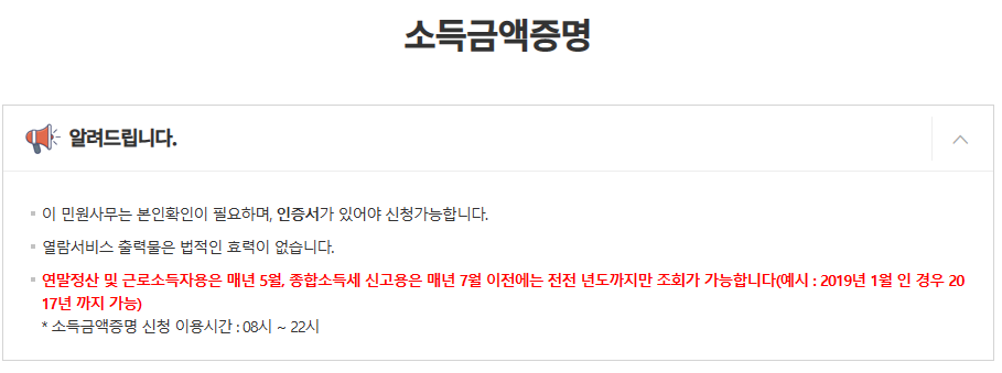 읽어보시면 아시겠지만 소득금액 증명서 인터넷발급을 받으려면 공인인증서가 필요하며 소득금액 증명서 인터넷발급 시간은 08시부터 22시까지입니다.