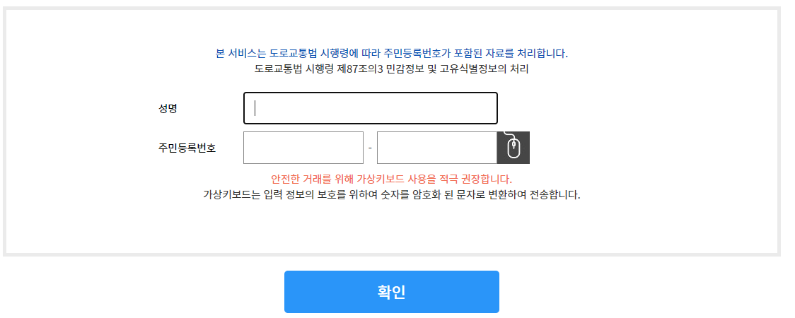 성명과 주민등록번호를 입력 후 아래쪽에 확인 버튼을 클릭하시기 바랍니다.