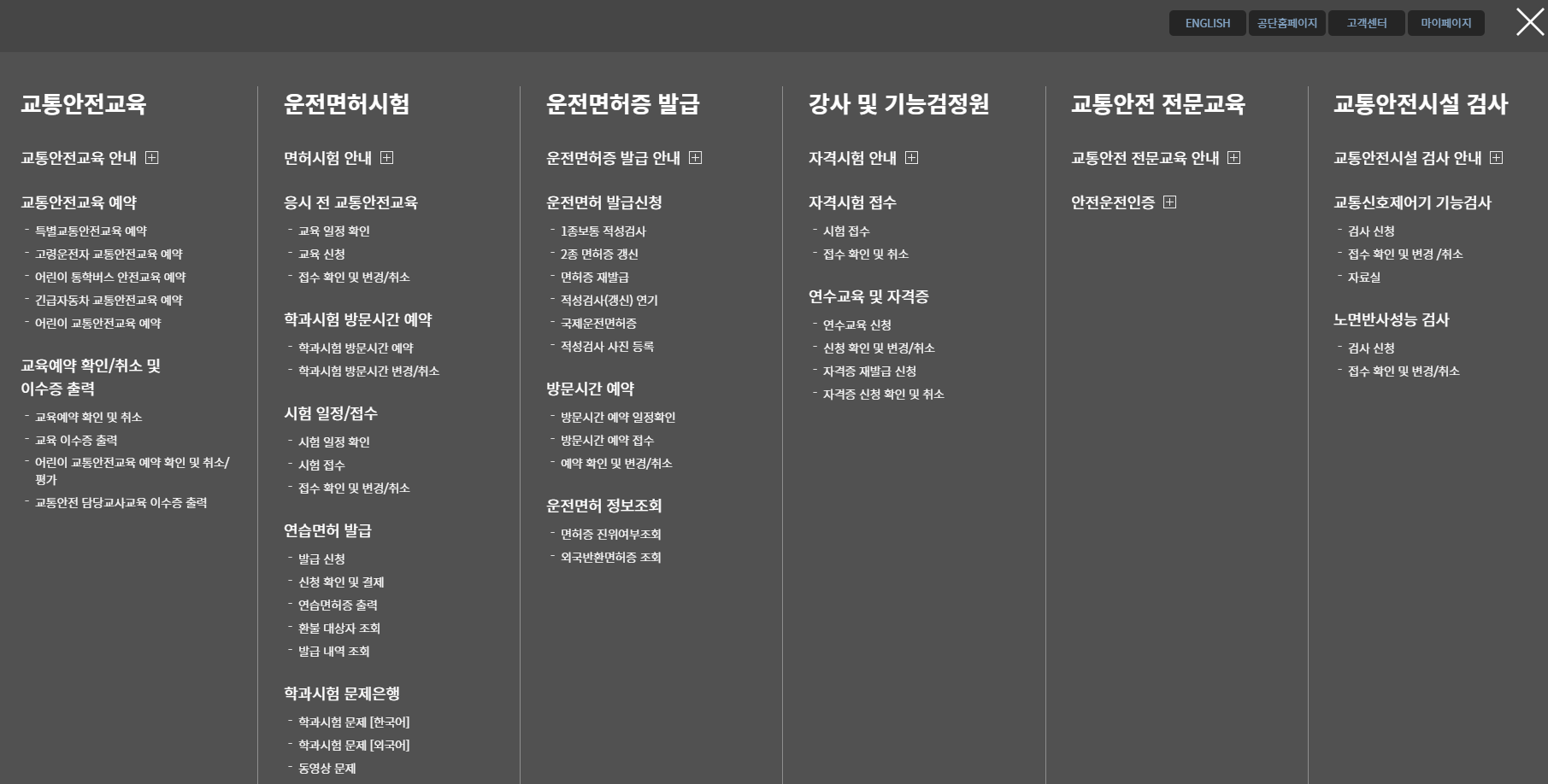 홈페이지에 처음 접속하시면 운전면허, 교통안전 교육과 관련된 여러가지가 보이실 것입니다. 운전면허 벌점조회를 하시려면 오른쪽 상단을 보시면 전체 메뉴를 클릭하여야 합니다.