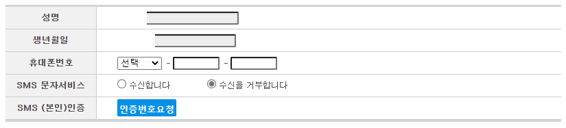 클릭하면 성명과 생년월일, 휴대폰 번호를 입력할 수 있는 창으로 이동이 됩니다.