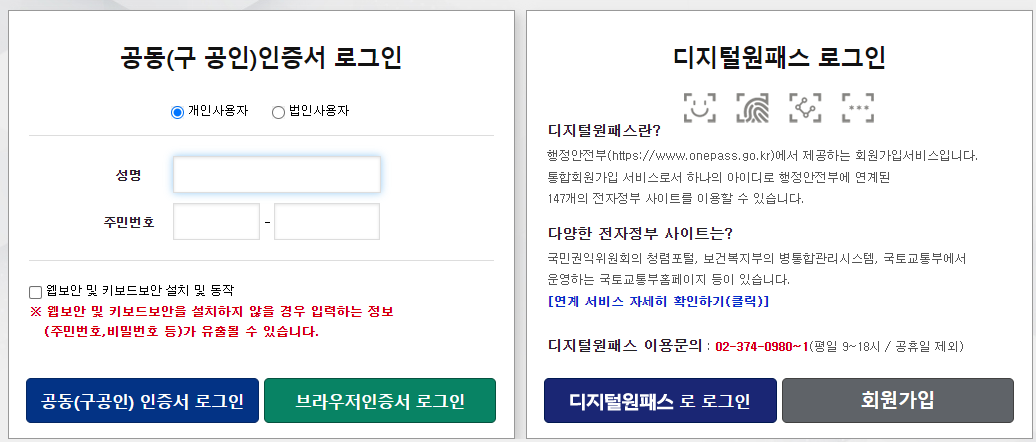 로그인은 성명, 주민등록번호를 입력 후 공동인증서를 사용하면 하실 수 있습니다. 별다른 회원가입은 하지 않으셔도 되고 성명 주민번호 입력 후 공동인증서 인증을 하면 됩니다.
