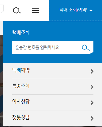 그리고 홈페이지 상단을 보시면 택배 조회/예약 버튼이 보이실텐데 클릭하시면 택배예약, 특송조회 등도 있습니다.