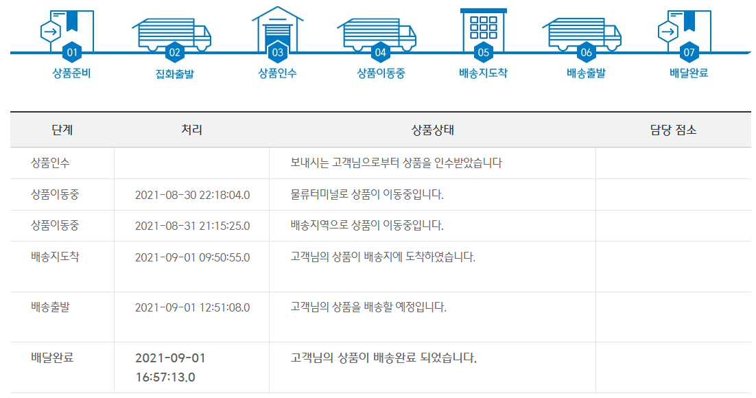 단계별로 처리시간, 상품상태, 담당 점소를 확인할 수 있습니다.